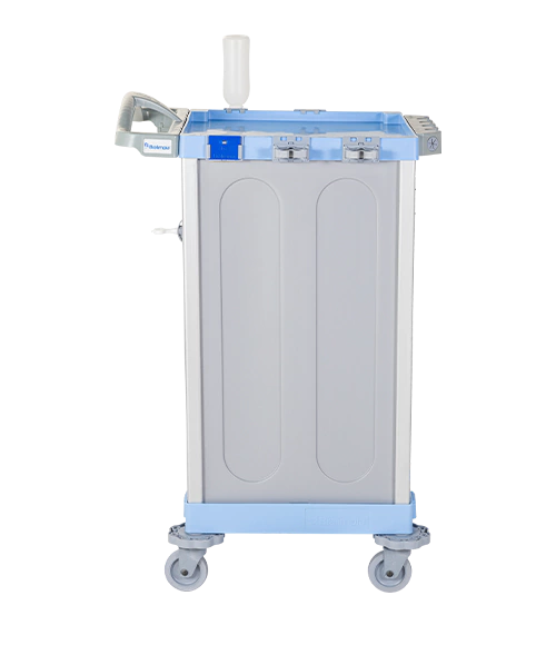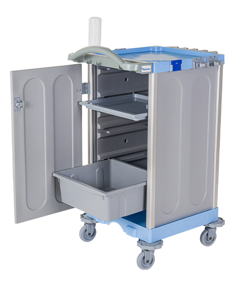 Carrinho hospitalar para transporte de enxoval; toalhas, lençol; fechado nas 3 laterais e 1 porta com sistema de chave.