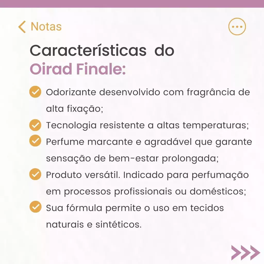 FINALE é um odorizante de alta performance, desenvolvido com fragrâncias de alta fixação e tecnologia resistente a altas temperaturas. Seu perfume marcante e agradável proporciona uma sensação prolongada de bem-estar, tornando qualquer ambiente ou tecido mais acolhedor e confortável.